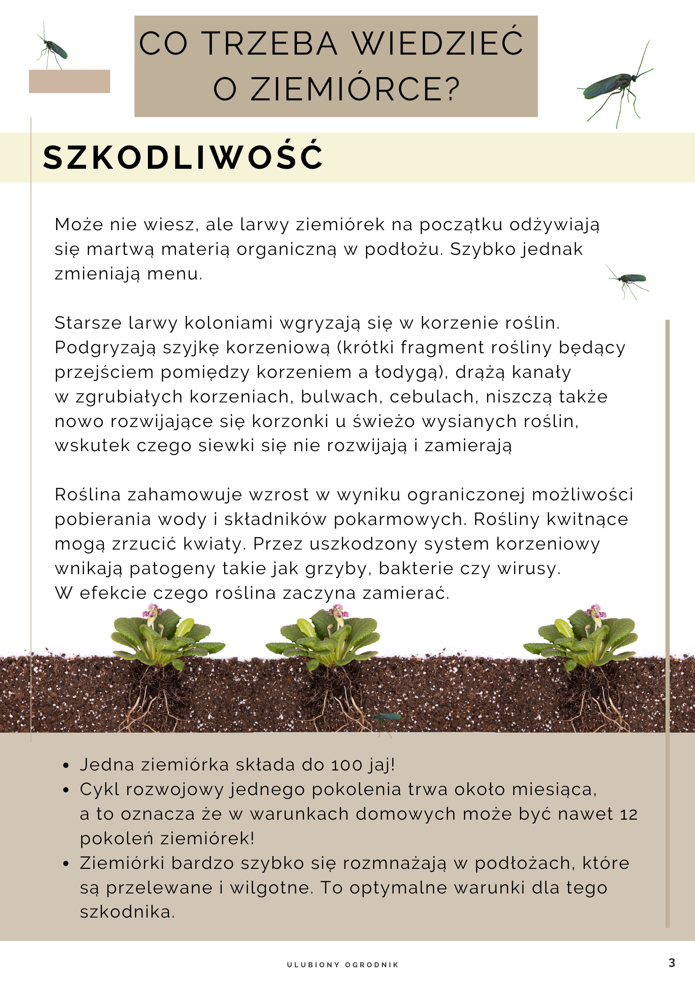 Na początku dobra wiadomość! Latająca ziemiórka nie stanowi bezpośredniego zagrożenia dla Twoich roślin. Nie ma ona aparatu gębowego, który uszkadzałby rośliny (liście, pędy, kwiaty czy korzenie). Dorosłe, latające owady stanowią wskaźnik. Informują Cię, że zaczęła się inwazja i w niedługim czasie mogą pojawić się problemy z Twoimi roślinami. Dlatego reaguj jak najszybciej! Jedna ziemiórka składa do 100 jaj, z których wylęgają się larwy niszczące system korzeniowy Twoich roślin.